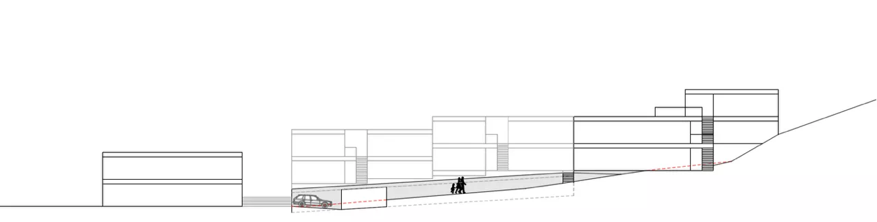 Au cœur du site, un couvert à voiture végétalisé crée un espace central ouvert, qui donne une sensation d’ampleur — amplifiée par le dénivelé naturel du terrain.