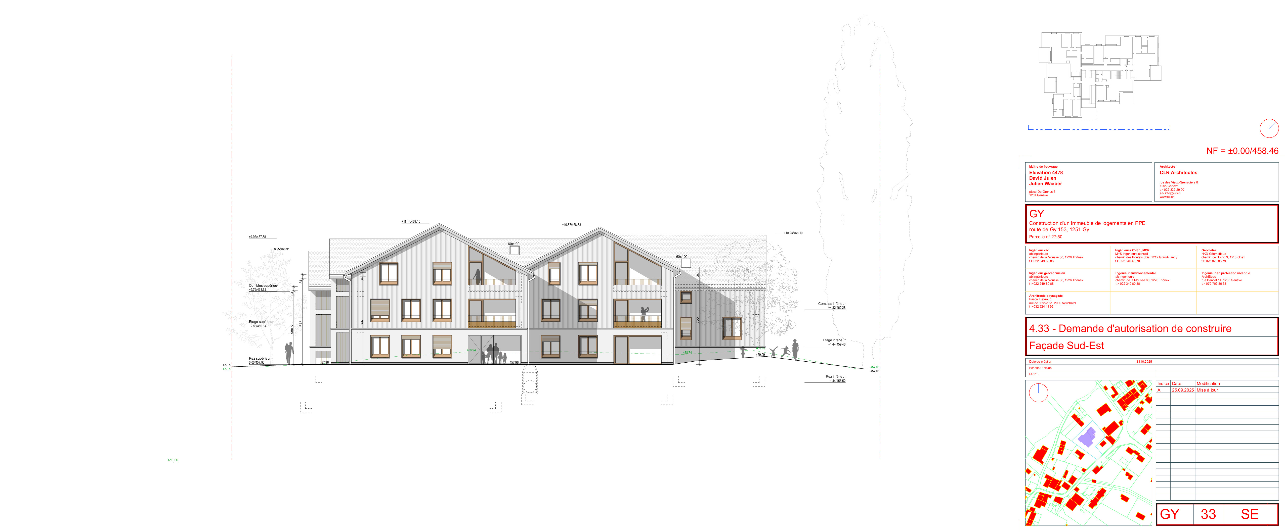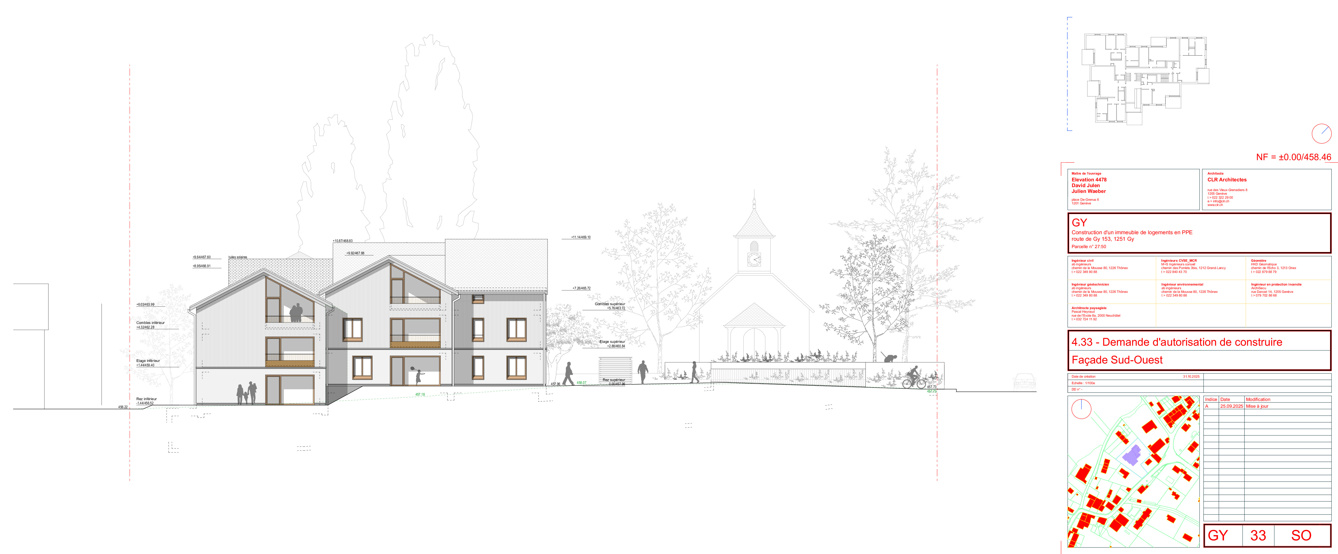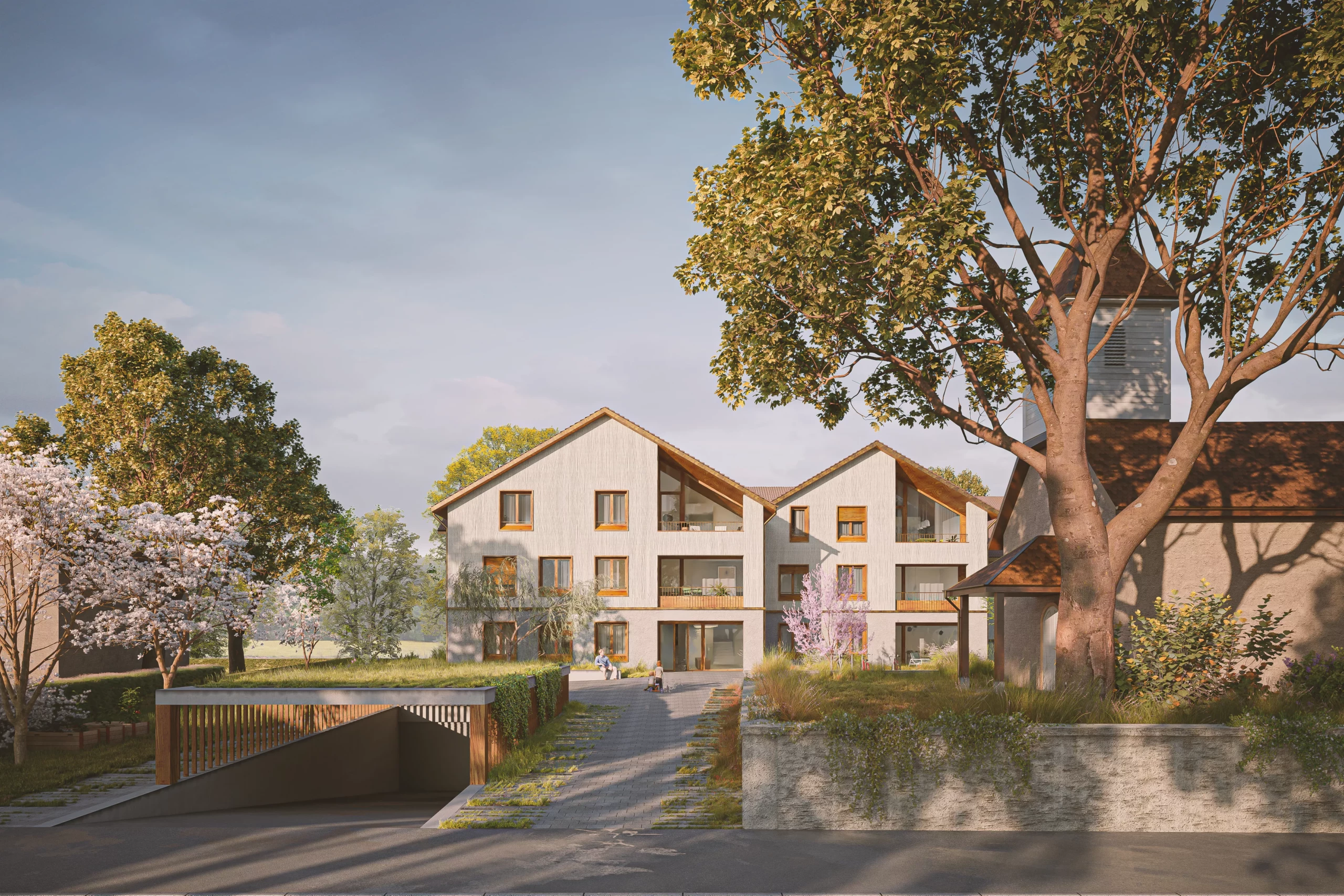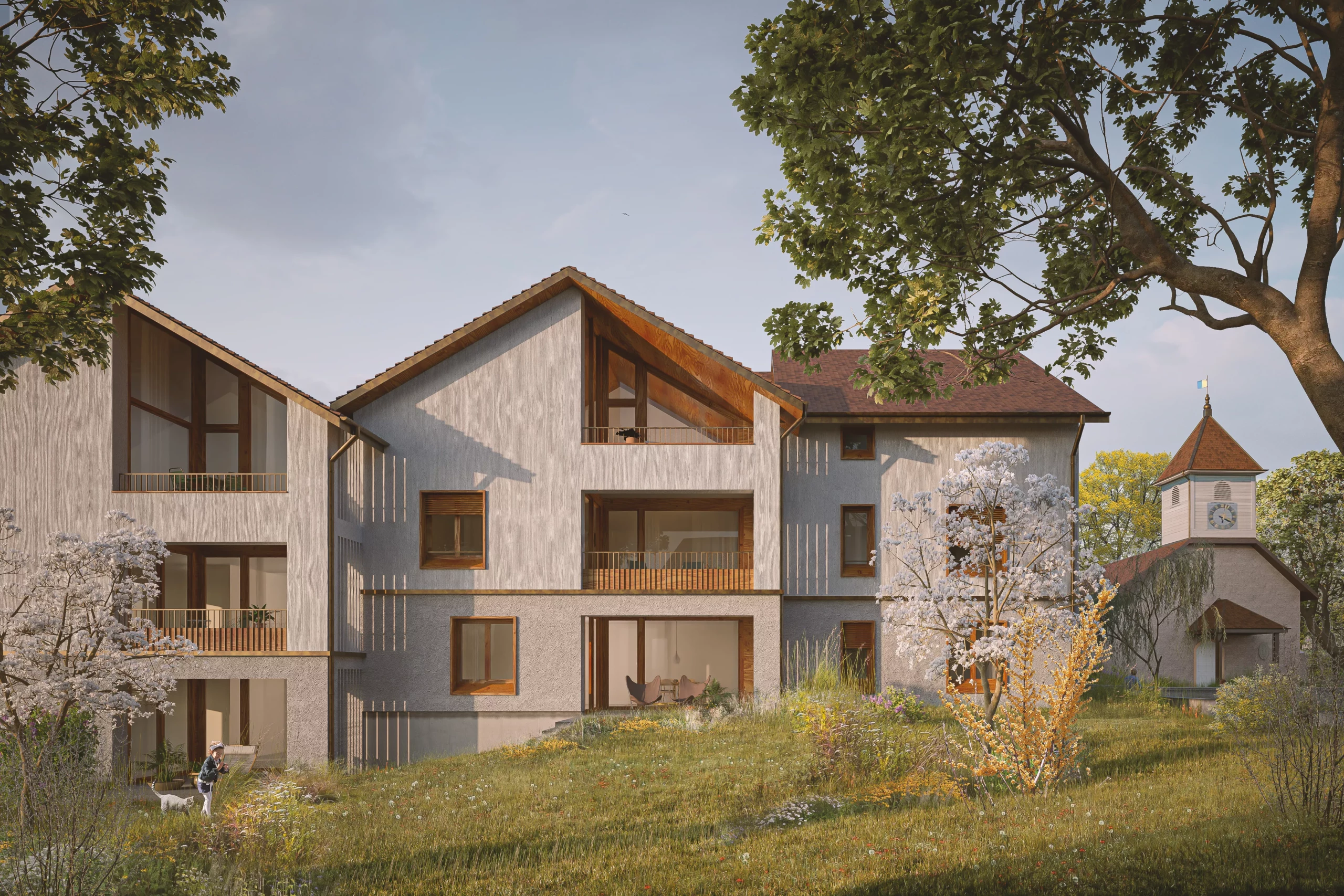 Dans le cœur du village de Gy, à deux pas du temple protestant inauguré en 1611 et face à la mairie, ce projet immobilier s’inscrit avec discrétion et respect dans le tissu historique et paysager du lieu. Implanté sur le lieu-dit « Les Vignes du Seigneur », il épouse la pente douce du terrain et préserve les grands arbres existants, offrant un espace de respiration face au temple. L’architecture s’inspire des maisons villageoises : six volumes accolés, toitures en tuiles plates, façades en crépis « à l’ancienne », fenêtres et volets en bois — tout en affirmant sa contemporanéité par la finesse des détails et l’intégration discrète de tuiles solaires photovoltaïques. Les appartements, de trois à cinq pièces, bénéficient d’orientations variées pour optimiser lumière et vue. L’aménagement extérieur propose un chemin d’entrée en pavés engazonnés, un verger et des potagers le long de la route de Gy, libérant la vue sur le Jura. Les jardins des rez-de-chaussée s’ouvrent sans barrière, en prairies fleuries et fougères, favorisant un espace partagé et vivant. Une place de rencontre et un espace de jeux complètent ce cadre, à deux pas du temple. Le projet intègre dès sa conception les principes de durabilité et d’efficacité énergétique : il obtiendra le label HPE (Haute Performance Énergétique), avec un chauffage 100 % renouvelable assuré par une pompe à chaleur sol/eau, et une production d’électricité via des tuiles solaires intégrées. Un habitat pensé pour vivre bien, ensemble, et en harmonie avec le paysage.